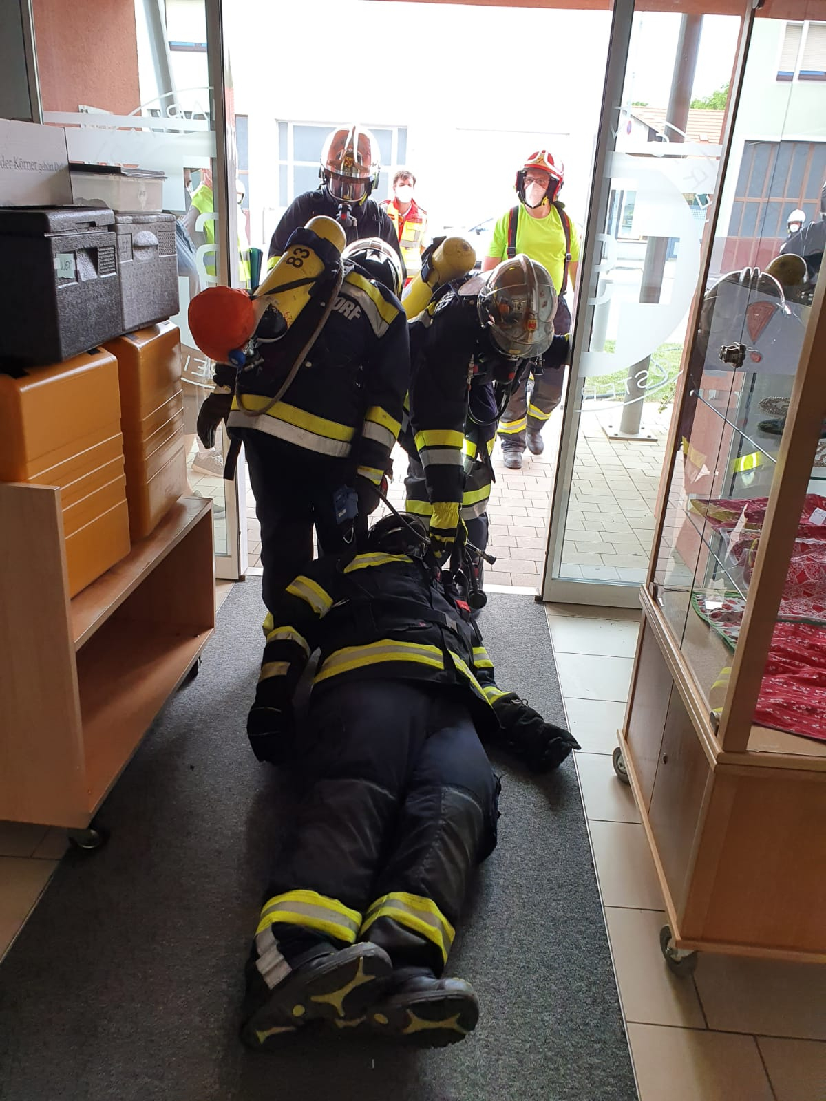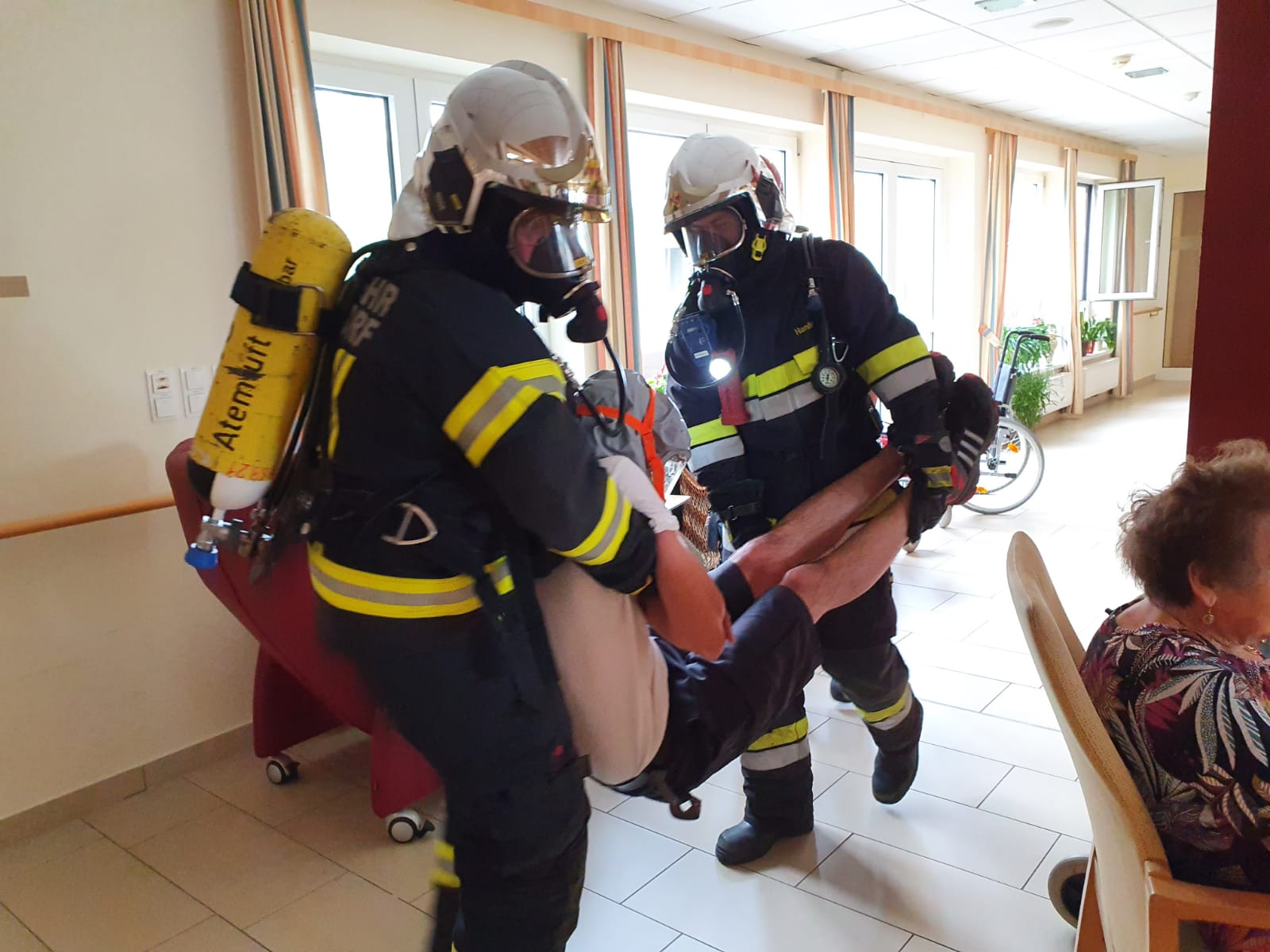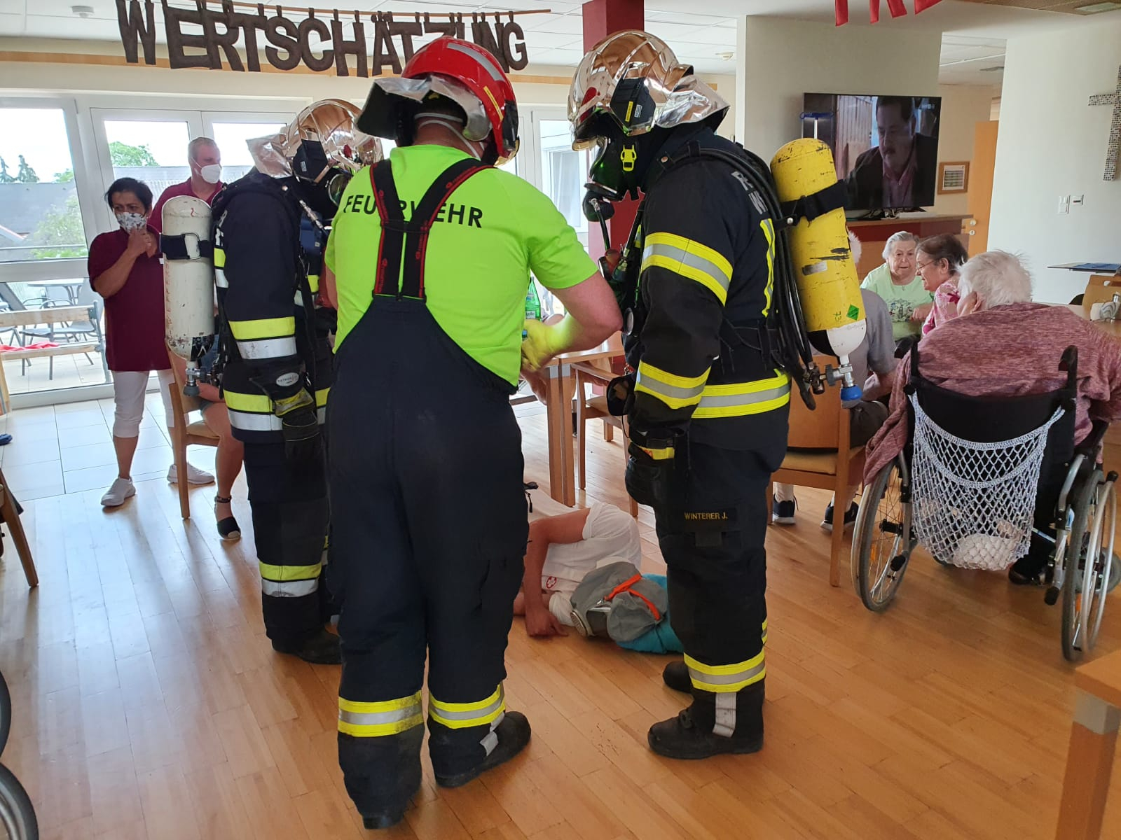 Als besondere Übungseinlage wurde simuliert, dass ein Atemschutzträger der Feuerwehr ohnmächtig wurde und von seinen Kameraden ebenfalls gerettet werden musste. Auch diese Übungseinlage meisterten die Einsatzkräfte bravourös und so zeigten sich alle beteiligten Einsatzorganisationen und auch die Leitung des Pflegekompetenzzentrums sehr zufrieden mit der Übung.