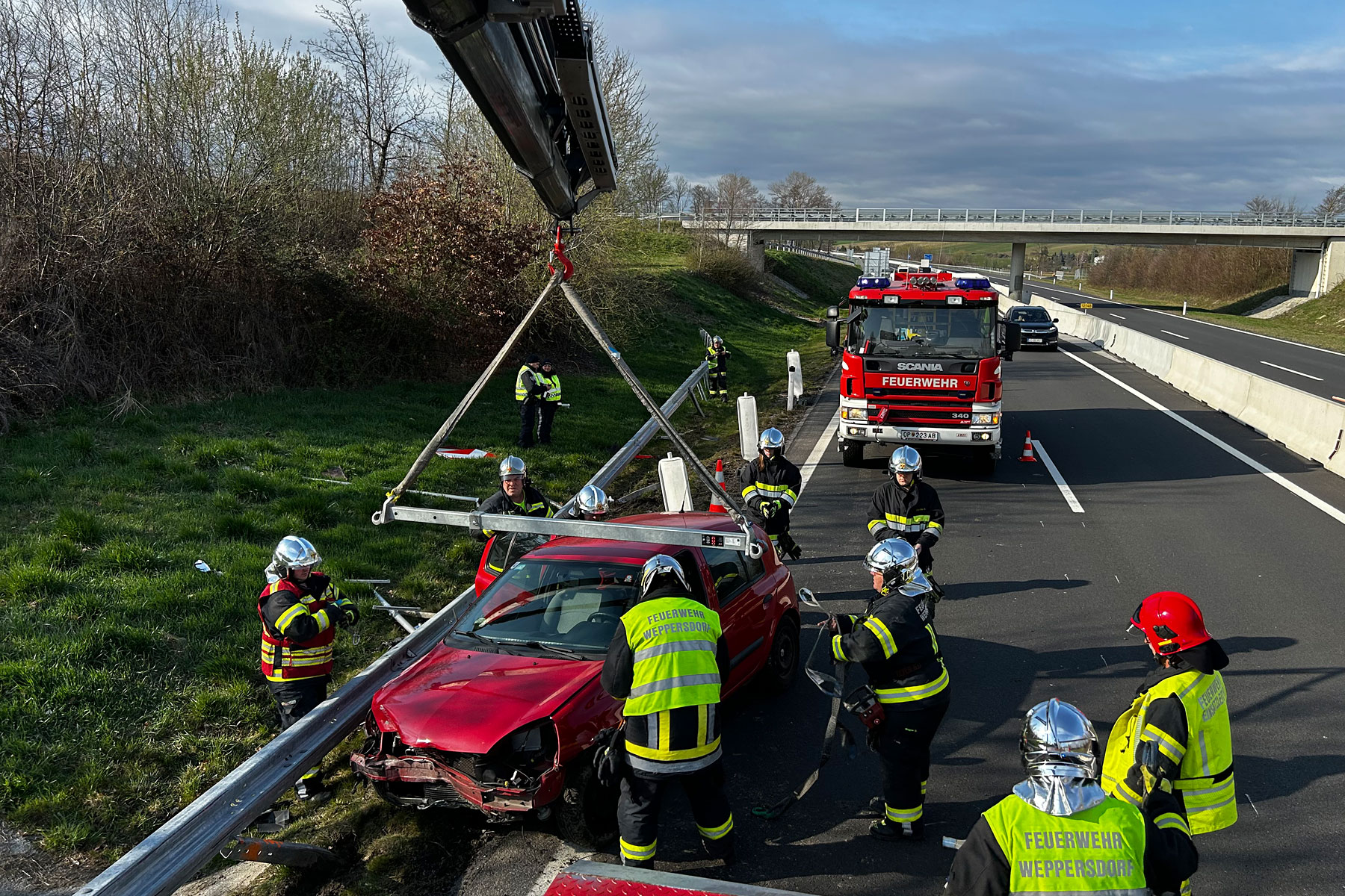 Glücklicherweise ohne Verletzungen endete ein Ausrutscher für eine Dame aus Wien mit ihrem Fahrzeug auf der S31 bei Weppersdorf. Sie war aus unbekannter Ursache in die Leitplanken gekracht. Die Feuerwehr Weppersdorf wurde von der Polizei um Hilfe gerufen und konnte das Unfallauto rasch unter der Leitplanke hervorziehen und anschließend mittels Kran bergen.
