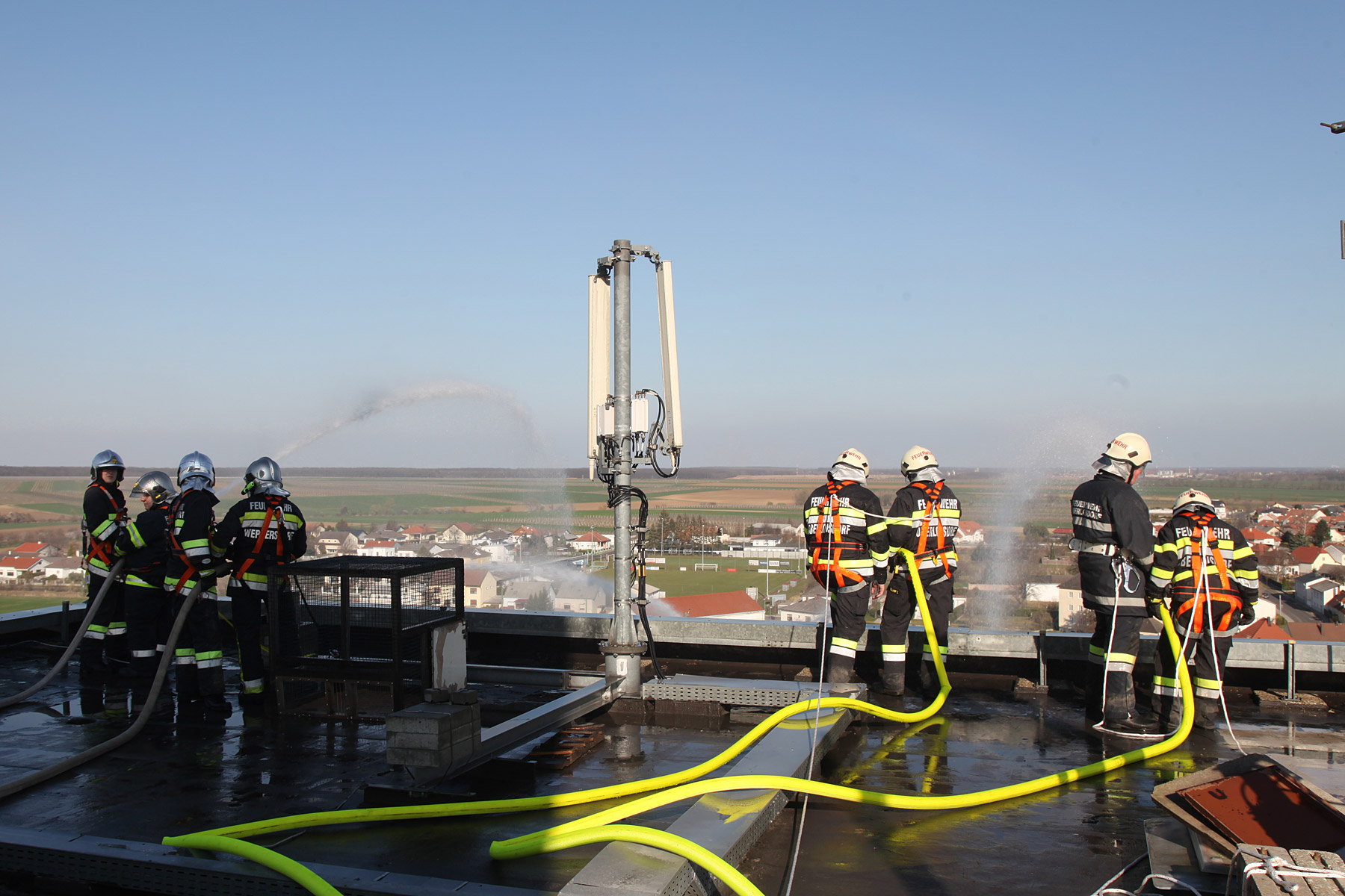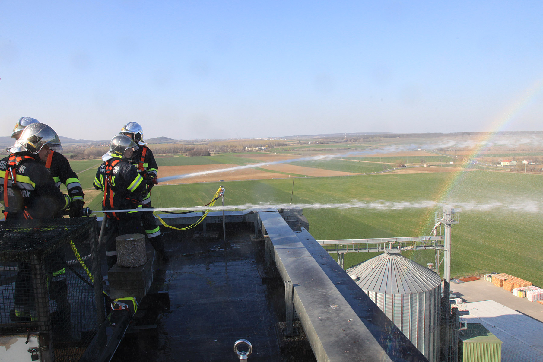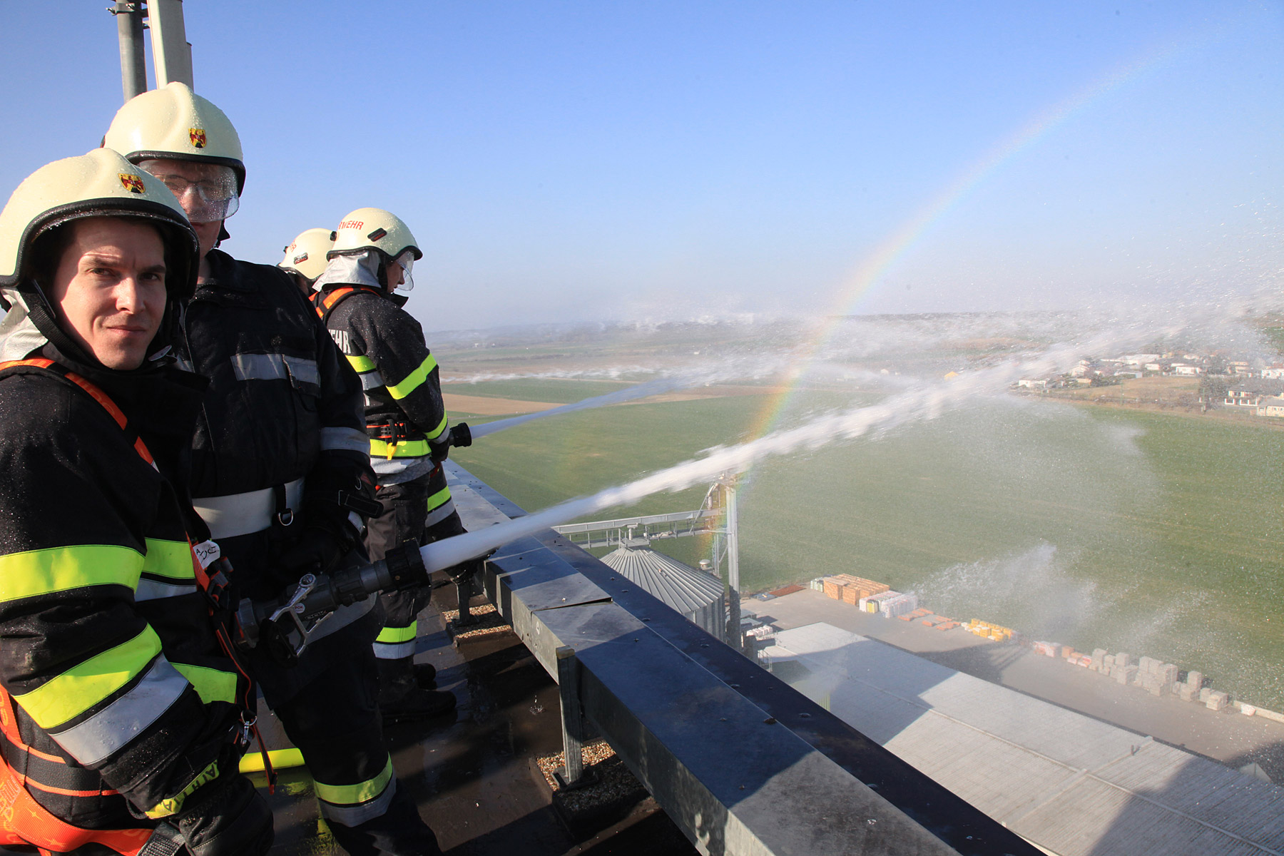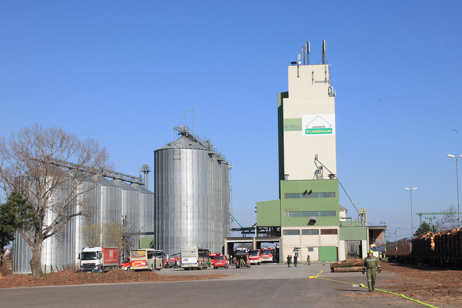 Dort mussten einerseite Löschleitungen über lange Distanzen aufgebaut werden. Zudem musste eine Löschleitung auf die rund 40 Meter hohe Plattform des Silos des Lagerhaus Deutschkreutz gebracht werden, eine schweißtreibende Arbeit für die Einsatzkräfte. Zeitgleich galt es im Keller des Gebäudes unter schwerem Atemschutz mehrere verletzte Personen zu retten.