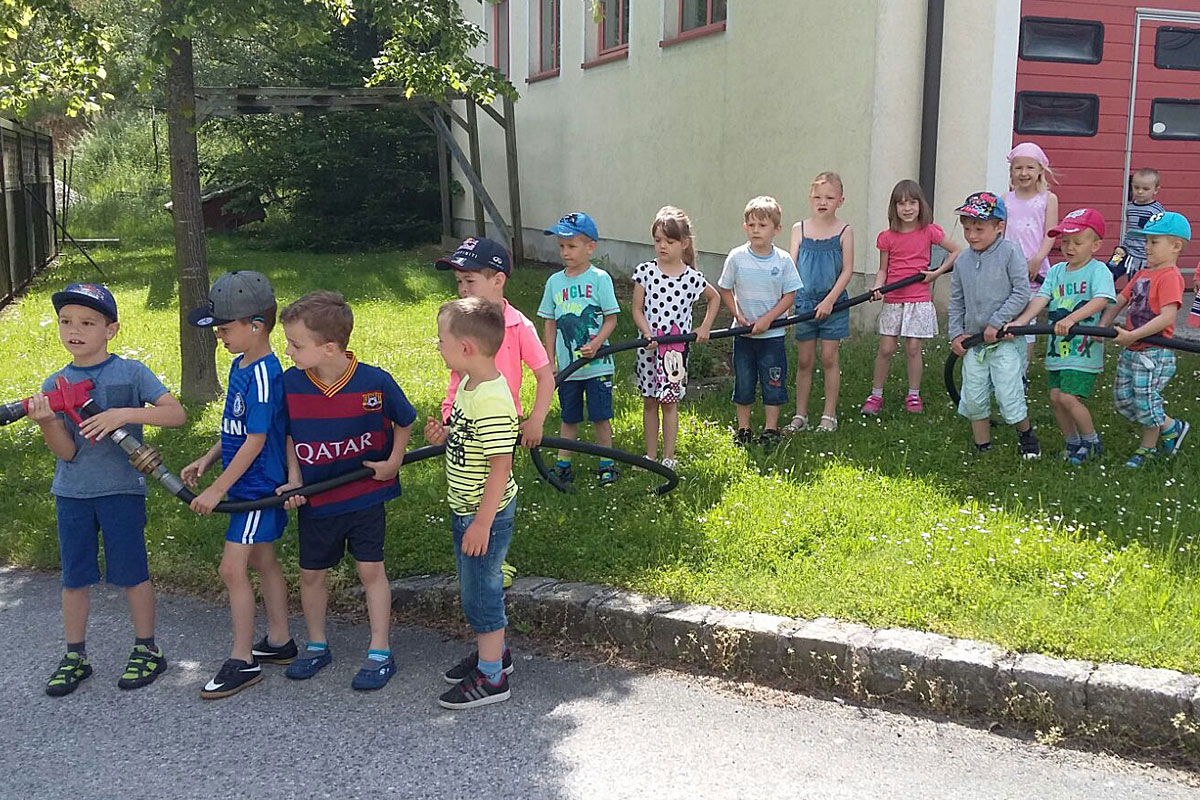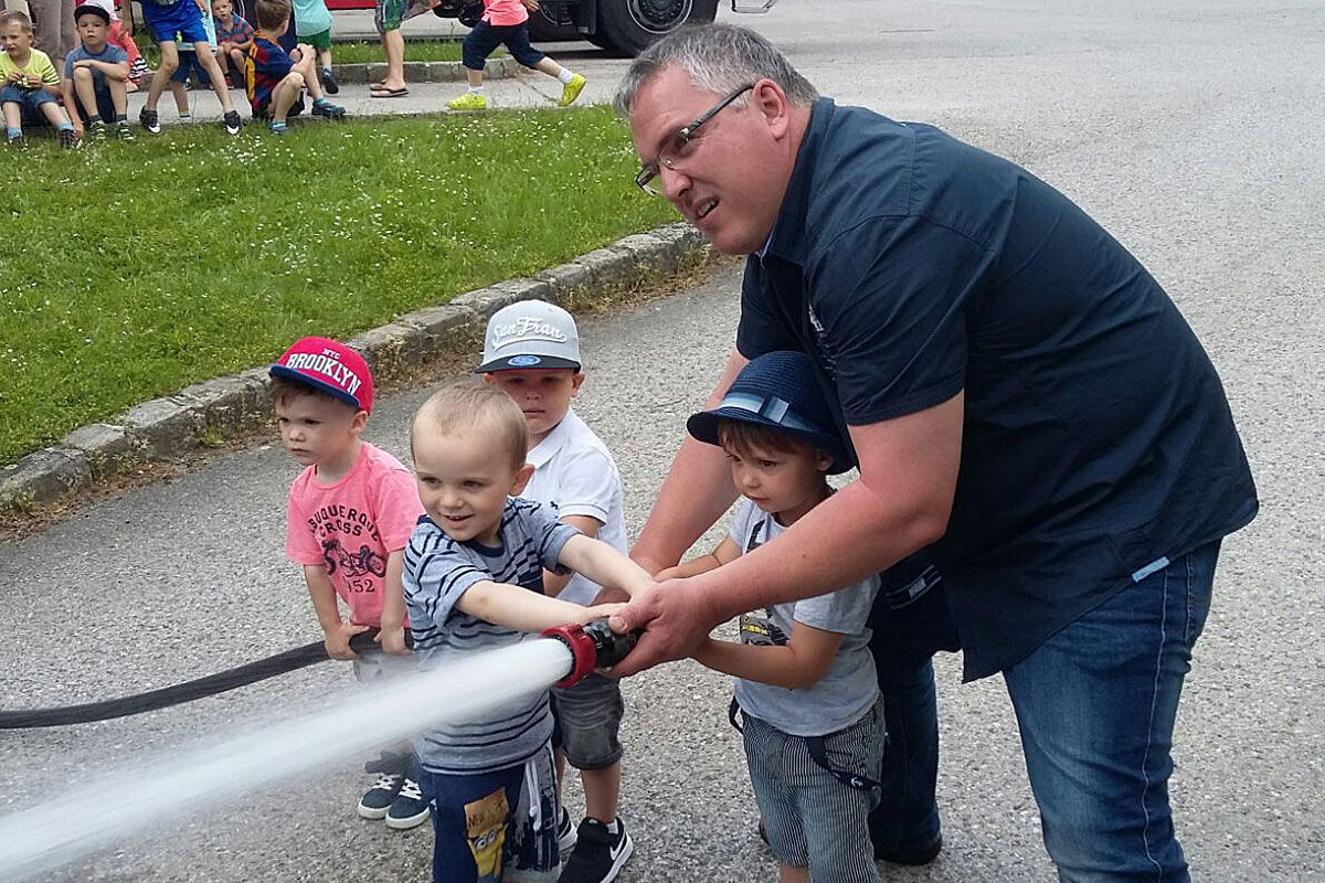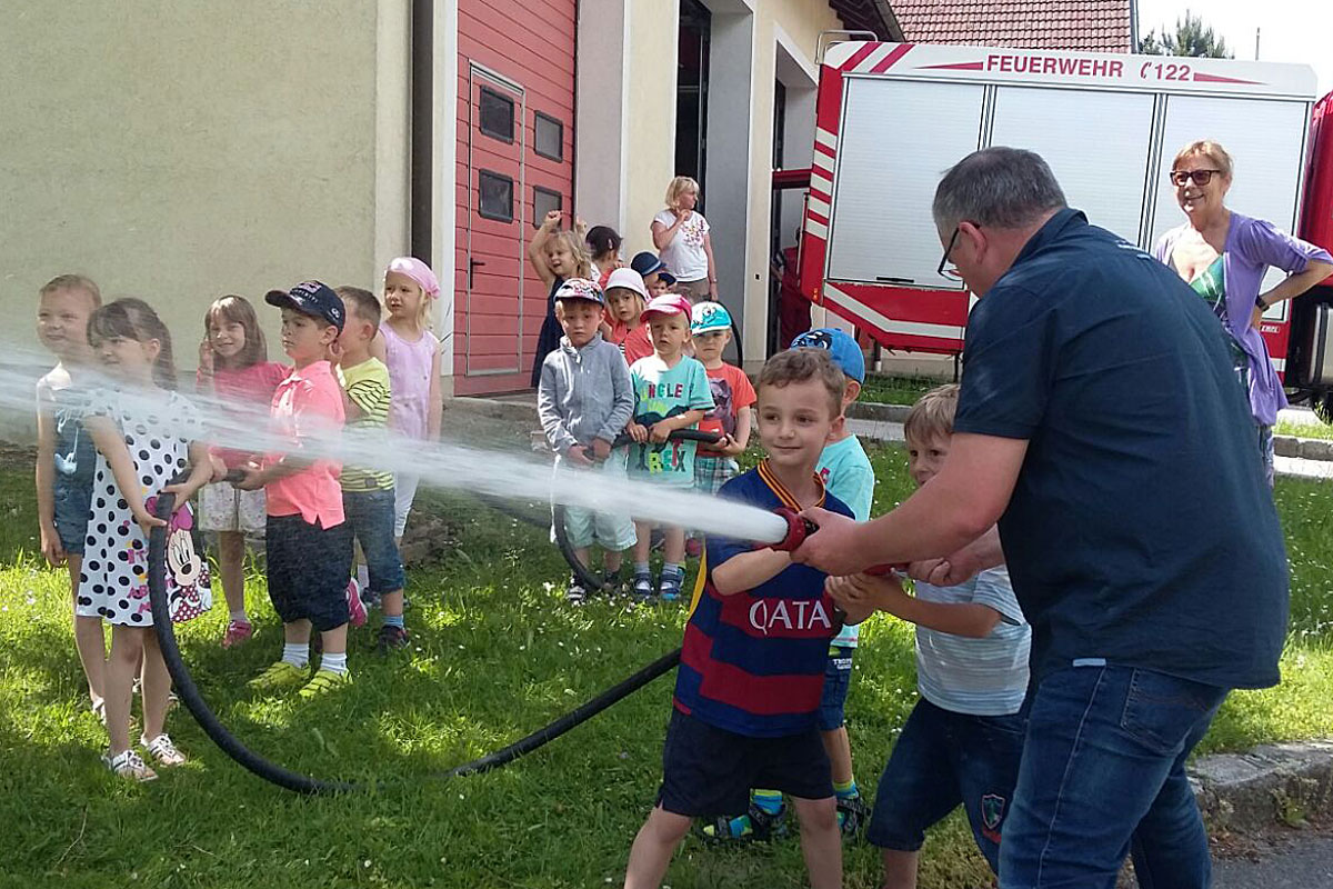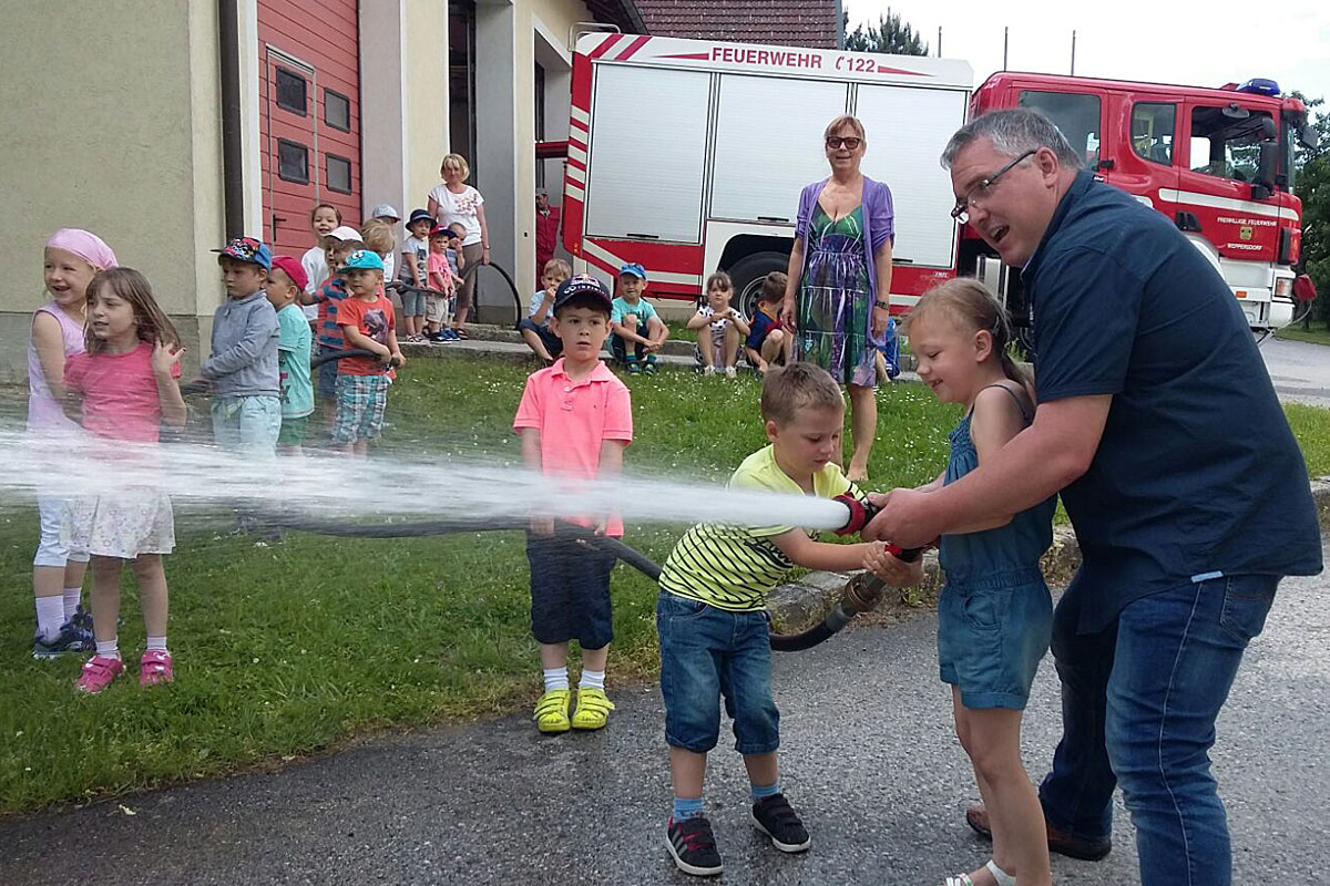 Die Faszination für die Feuerwehr war allen 22 Kindergartenkindern aus Weppersdorf ins Gesicht geschrieben, als sie am 30. Mai die roten Autos, Helme und Schutzkleidung der Freiwilligen Feuerwehr Weppersdorf bestaunten. Diesmal gab es alles zum Angreifen, denn Kommandant OBI Klaus Kallinger und Gerätewart HLM Christian Schey nahmen sich ausführlich Zeit, um den kleinen Jungen und Mädchen die Geräte der Feuerwehr genau zu erklären. Ebenso wiesen sie aber auch auf die Gefahren beim Umgang mit Feuer hin. Highlight für die Kinder war dann, dass sie mit der Schnellanrgiffseinrichtung der FF Weppersdorf selbst einmal in die Schuhe der Florianijünger schlüpfen durften, einen Schlauch auslegen und dann ein angenommenes Feuer bekämpfen konnten.