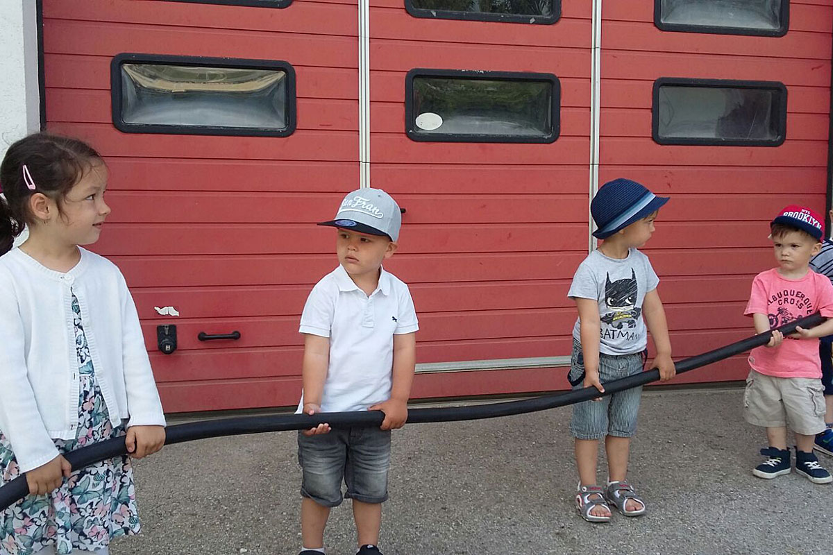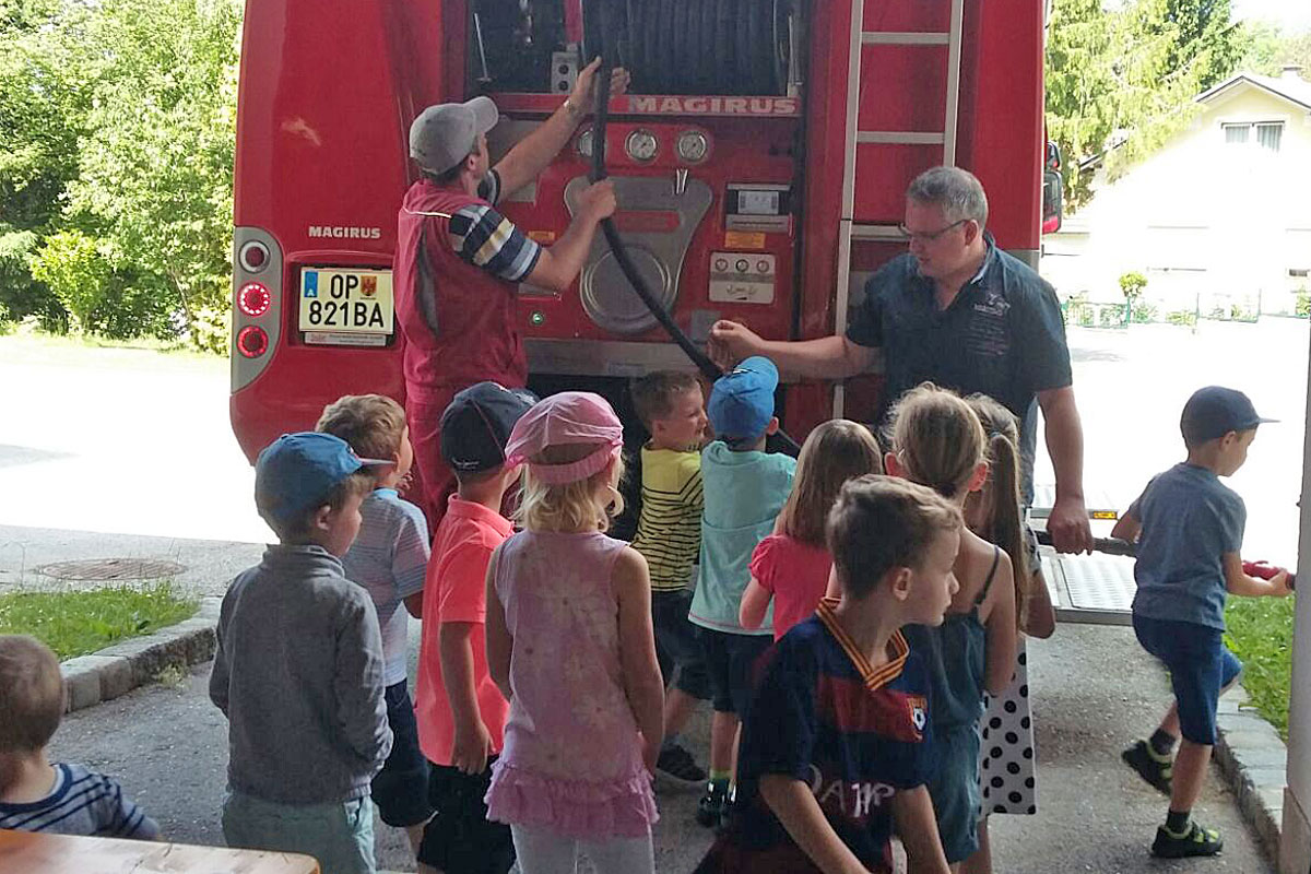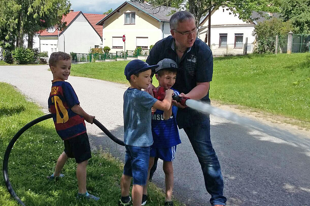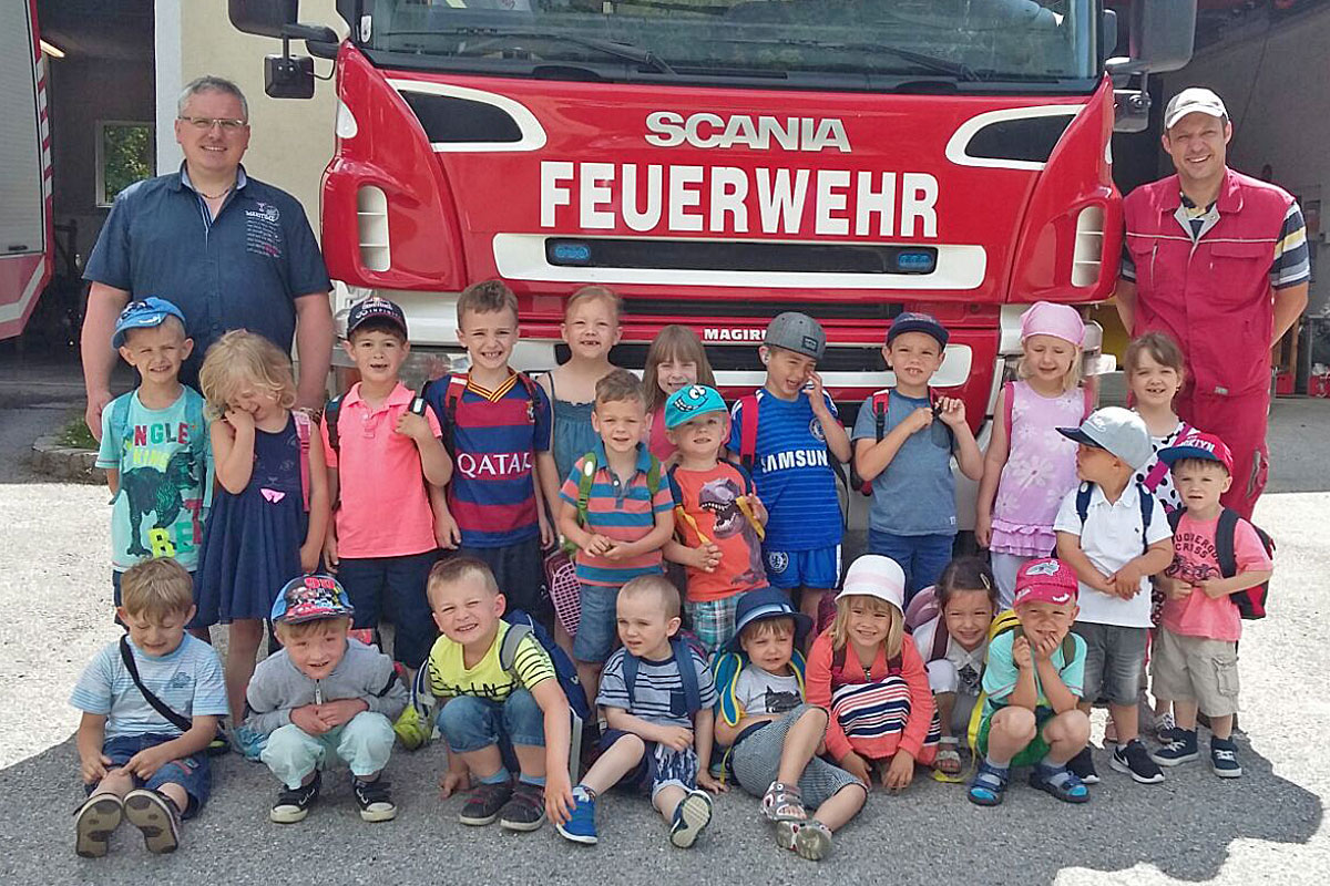 Die Faszination für die Feuerwehr war allen 22 Kindergartenkindern aus Weppersdorf ins Gesicht geschrieben, als sie am 30. Mai die roten Autos, Helme und Schutzkleidung der Freiwilligen Feuerwehr Weppersdorf bestaunten. Diesmal gab es alles zum Angreifen, denn Kommandant OBI Klaus Kallinger und Gerätewart HLM Christian Schey nahmen sich ausführlich Zeit, um den kleinen Jungen und Mädchen die Geräte der Feuerwehr genau zu erklären. Ebenso wiesen sie aber auch auf die Gefahren beim Umgang mit Feuer hin. Highlight für die Kinder war dann, dass sie mit der Schnellanrgiffseinrichtung der FF Weppersdorf selbst einmal in die Schuhe der Florianijünger schlüpfen durften, einen Schlauch auslegen und dann ein angenommenes Feuer bekämpfen konnten.