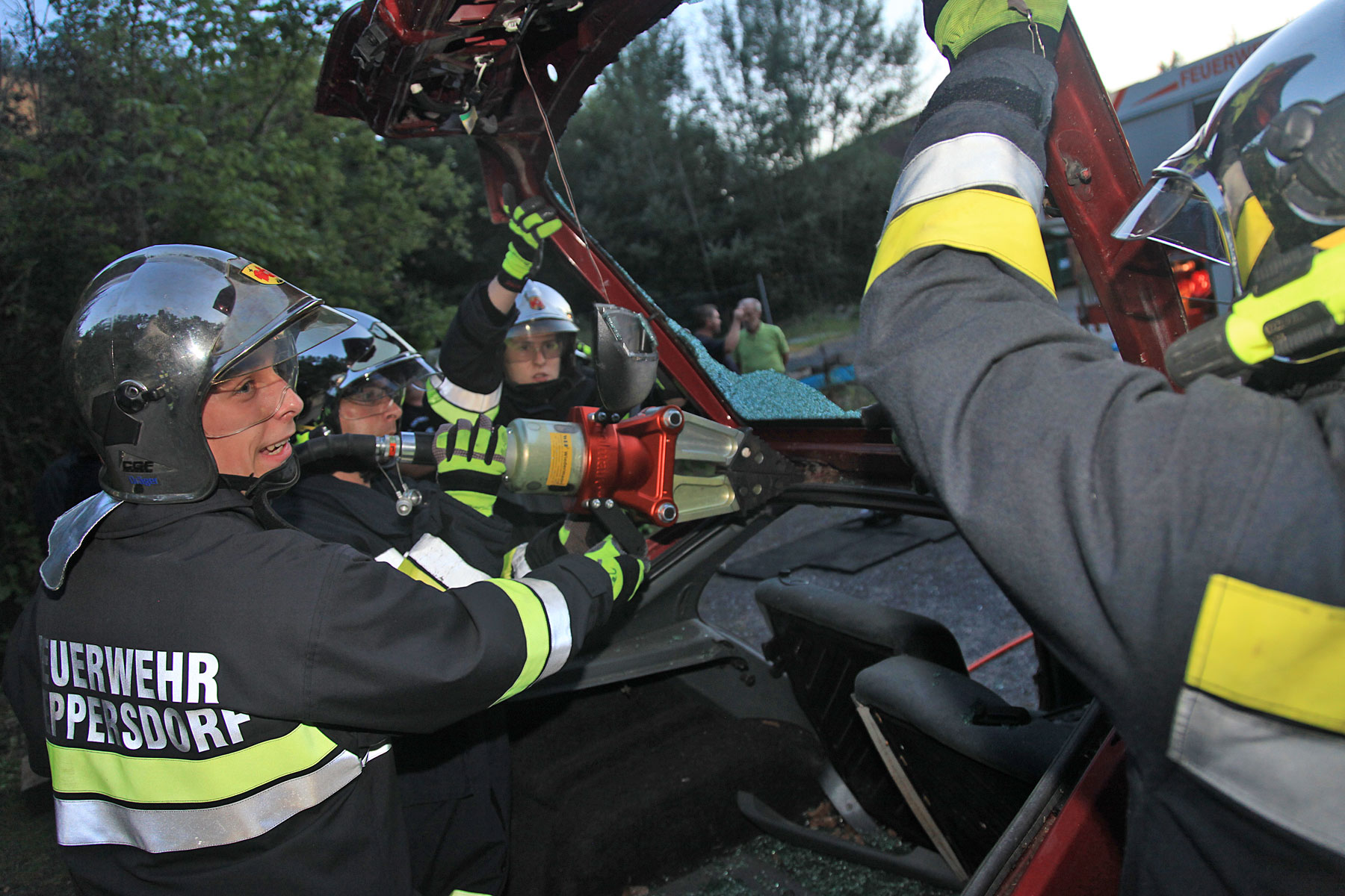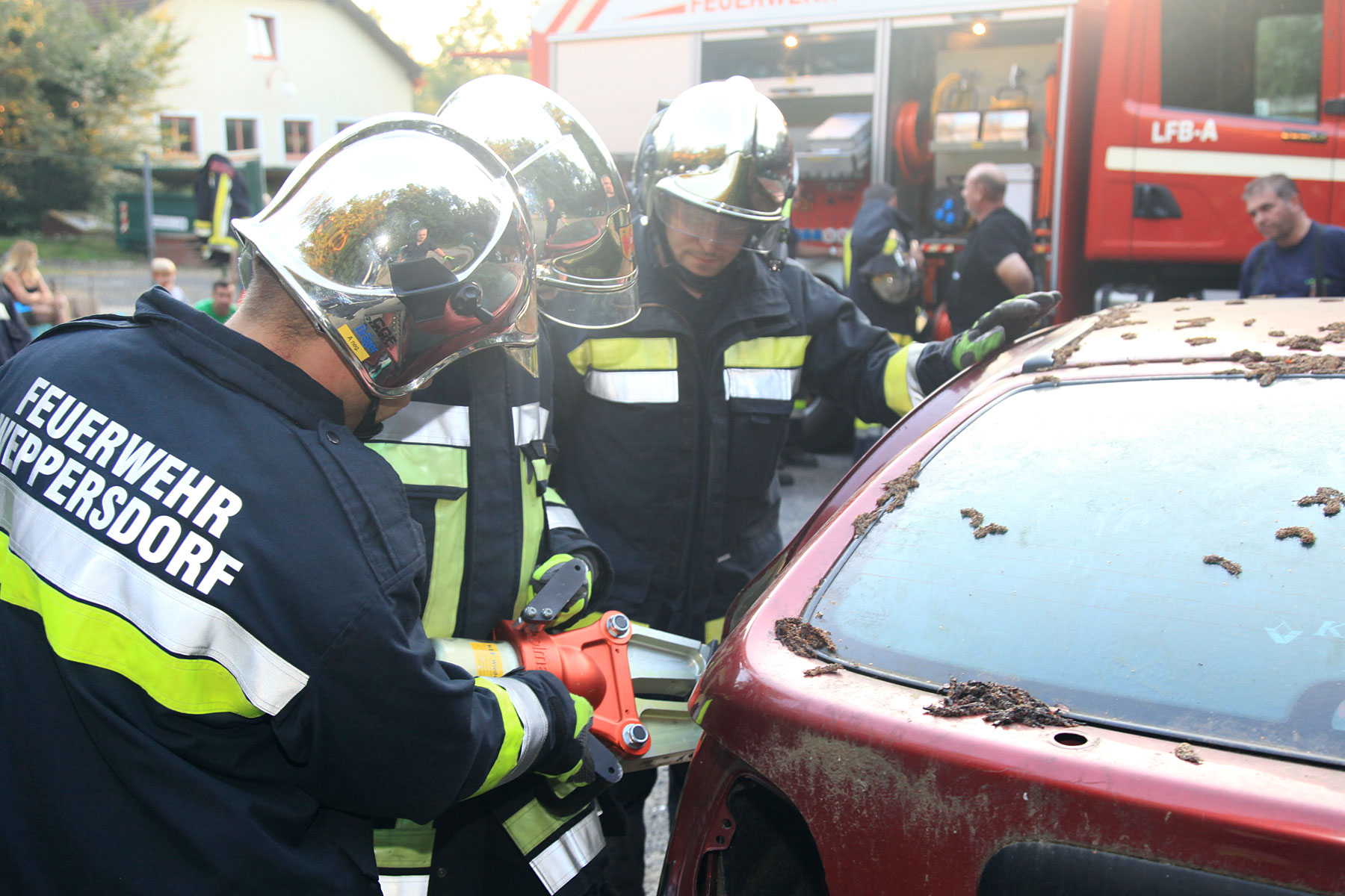 Die traditionell ruhigere Sommerzeit wird bei der Freiwilligen Feuerwehr Weppersdorf genutzt, um Aus- und Weiterbildungen zu intensivieren. So wurde am 19. August intenstiv das Thema technischer Einsatz beübt. Bei einem alten Auto konnten vor allem jüngere Mitglieder den richtigen Umgang mit Schere und Spreizer trainieren. Übungsleiter OBM Patrick Piniel und Ortskommandant OBI Klaus Kallinger erklärten den Kameraden, worauf zu achten sei, bevor an einem Übungsauto pratkisch geübt wurde. Bei der abschließenden Löschübung wurden verschiedene Löschmittel – vom Pulverlöscher bis zur Schaumlöschanlage des Löschfahrzeuges (LF-B) ausprobiert. Sowohl Übungsteilnehmer als auch Übungsleitung war bei der abschließenden Übungsbesprechung mit dem Training zufrieden.